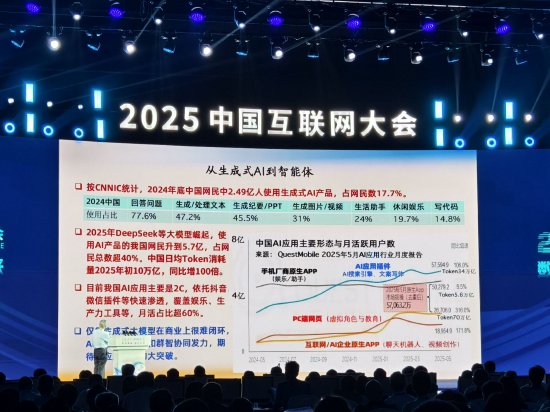 他援引CNNIC数据,2024年底中国网民中2.49亿人使用生成式AI产品,占网民数17.7%;2025年DeepSeek等大模型崛起,使用AI产品的我国网民升到5.7亿,占网民总数超40%。中国日均Token消耗量2025年初10万亿,同比增100倍。