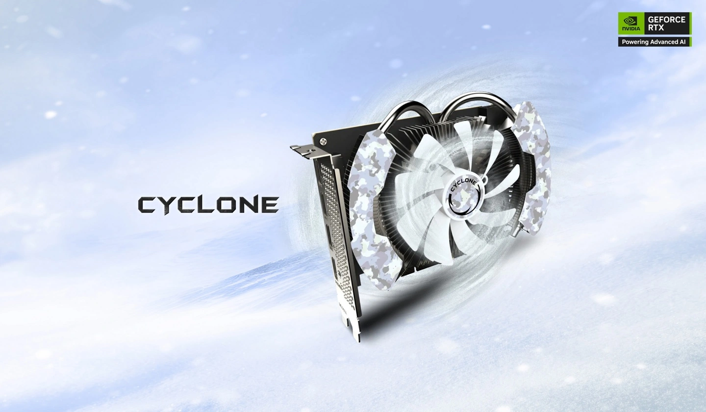 作为“旋风”系列的一员,这些显卡采用了经典的双热管铝挤鳍片向日葵散热器,配备单颗暴露在外的 100mm 九叶风扇。热管外侧的霜雪迷彩现代美学设计和怀旧的散热模具完美融合。